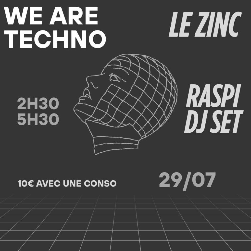 🎧 SOIRÉE TECHNO AU ZINC avec DJ Raspi 🗓️ Mardi 29 juillet – 🕝 À partir de 2h30 du matin 📍 Au Zinc – Casino de la Plage